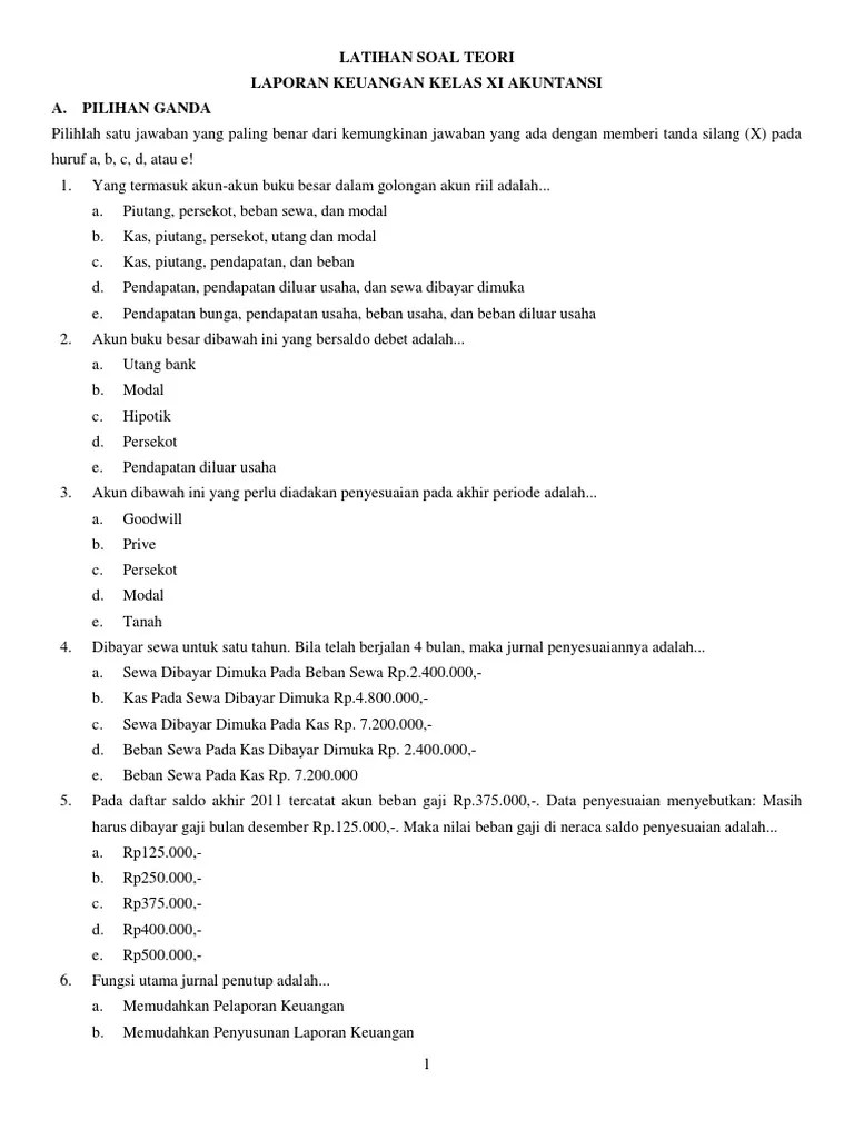 Hal tersebut tergantung dari jenis perusahaan berikut jenis transaksi keuangan yang terjadi di dalamnya. Komputer akuntansi kelas xi jilid 1. Sebenarnya masih banyak sifat sifat persamaan nilai. 20150409 latihan pilihan ganda perusahaan dagang 1. Dibeli barang dagang dari pd indah rp. Meteorite impact and dinosaur extinction. Buat kamu yang sedang duduk di bangku sekolah khususnya untuk sma kelas 12, materi belajarmu, disini kami bagikan 15 contoh soal pilihan ganda akuntasi perusahaan jasa beserta jawabannya. Dilihat dari sudut fungsinya, akuntasi diartikan sebagai…. Contoh soal pilihan ganda teks laporan hasil observasi lho dan jawabannya hallo adik adik semua bagaimana kabarnya. Khusus untuk transaksi bank charges dan interest income dicatat di ….